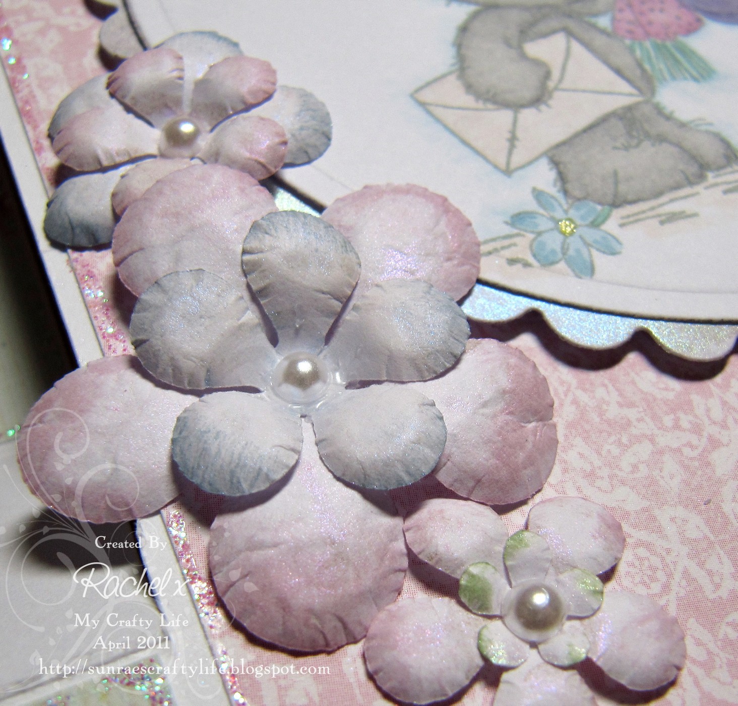 The flowers were cut on my Cricut and were another first- the first cut file I designed myself in my graphics program after getting the cutting software for my Cricut... the software paid for itself in this card alone as I'd been contemplating the set of punches in this shape for ages and now I can have them in as many sizes as I like- and with no wrist pain from punching either!! :D :D I stamped a swirl on these and dusted Mica on to it but it mostly came off when I embossed them from the back (who’d have guessed- told you my brain was useless at the time!!lol) to get the shape and depth :S Still, they do shimmer prettily at least!!lol